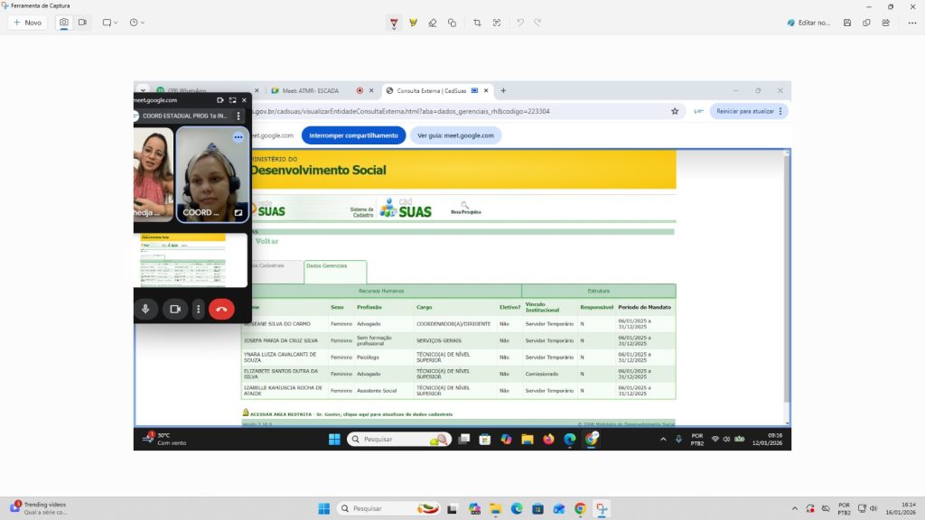 Resumo: O Apoio Técnico prestou orientações à equipe quanto à necessidade de que todos os profissionais estejam devidamente cadastrados no CadSUAS e vinculados ao CRAS de referência, bem como acerca do estudo da Resolução nº 219, que trata do processo de reordenamento do SPSBD-GC. Ressaltou-se a importância da utilização do sistema E-PCF para o registro das visitas domiciliares realizadas, considerando que a ausência dessas informações pode comprometer o repasse de recursos federais destinados ao custeio do programa. Destacou-se, ainda, a necessidade de manter a continuidade das ações em conformidade com as diretrizes estabelecidas pela Portaria nº 664/2021.