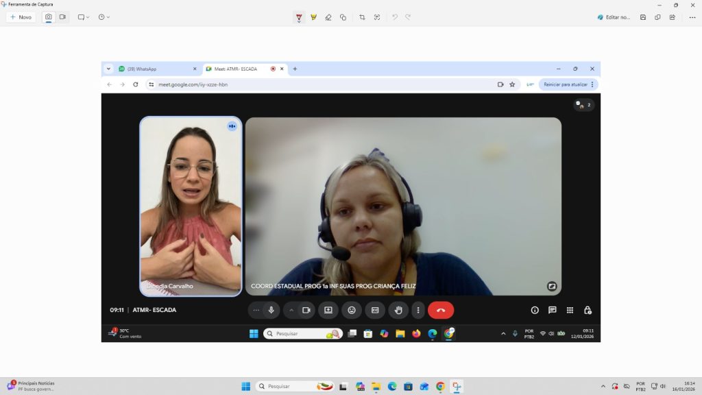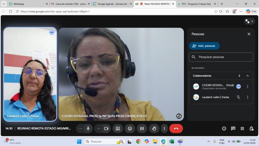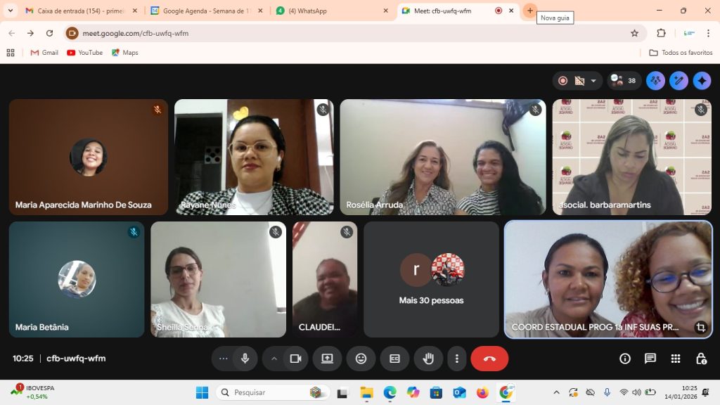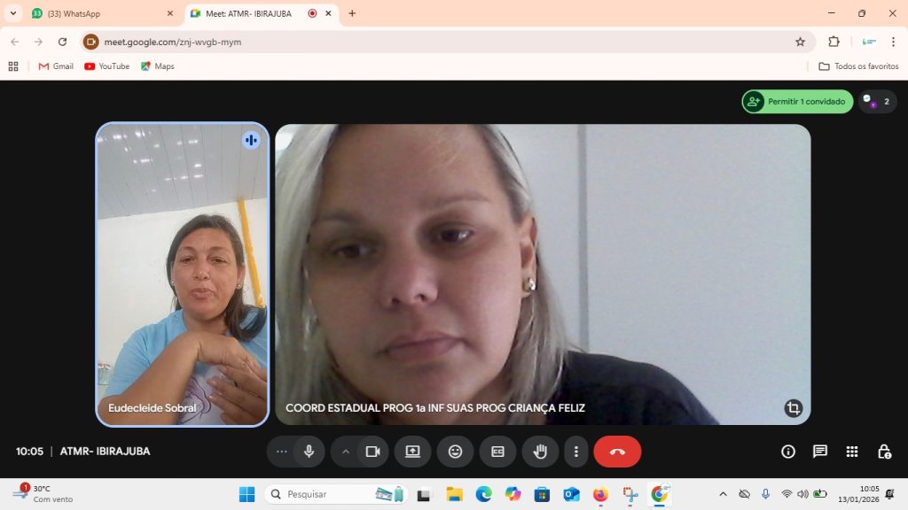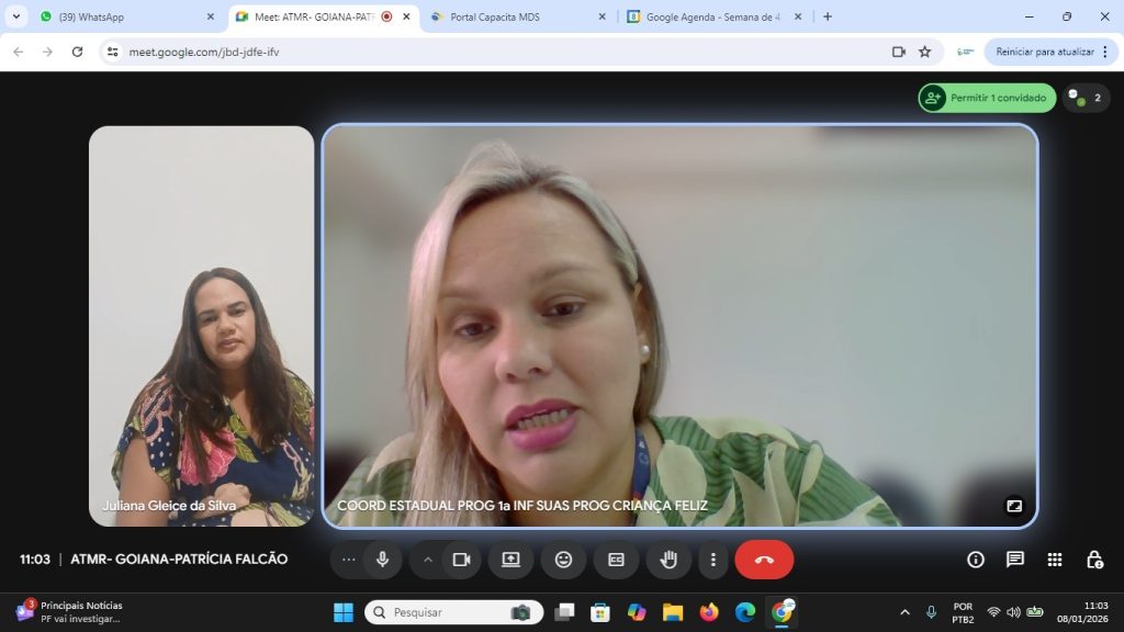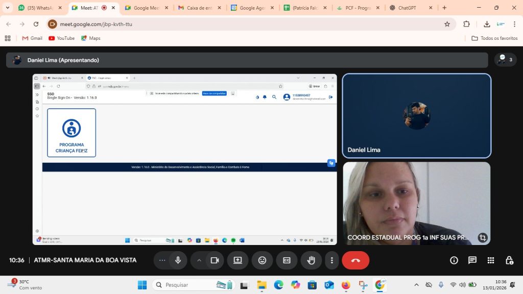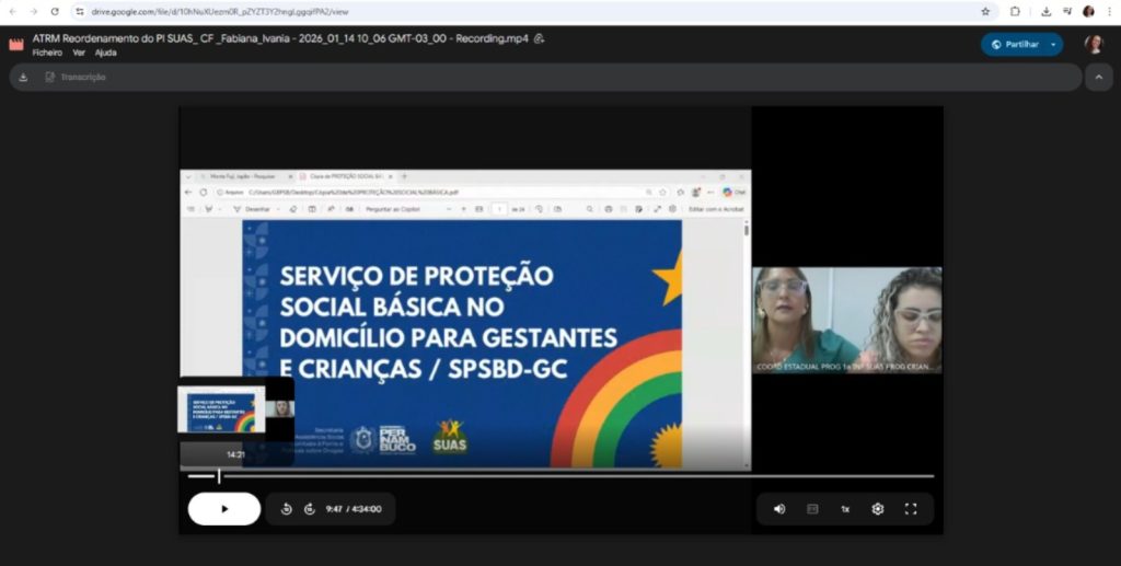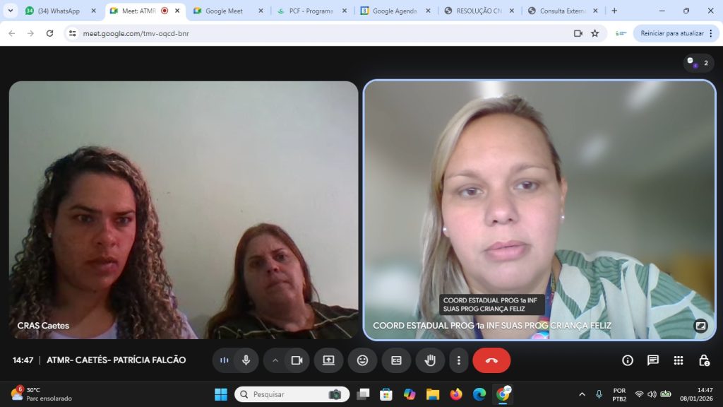 Registro Fotográfico: Rafaele Andrade: Técnica Social Data: 15/01/2026Local: Plataforma Google MeetModalidade: RemotaResumo: O apoio técnico teve como objetivo oferecer orientações sobre a execução do Primeira Infância no SUAS/CF através da Portaria de n° 664/21 e informações sobre o reordenamento do …