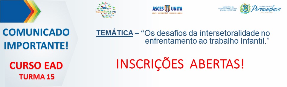 O Governo Paulo Câmara, a Secretaria de Desenvolvimento Social, Criança e Juventude (SDSCJ), a Executiva de Assistência Social (SEASS) e o Centro Universitário Tabosa de Almeida (ASCES-UNITA) realizarão a 9ª turma de Ensino a Distância (EaD), com temática pertinente “A Proteção Social à Criança e ao Adolescente: Um campo de contradições e desafios”. O curso será realizado de 27 de janeiro a 16 de fevereiro de 2017.