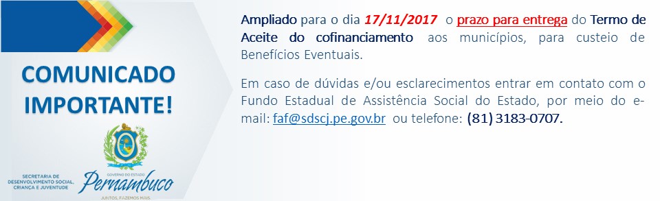 Ampliado para o dia 17/11/2017 o prazo para entrega do Termo de Aceite do cofinanciamento aos municípios, para custeio de Benefícios Eventuais